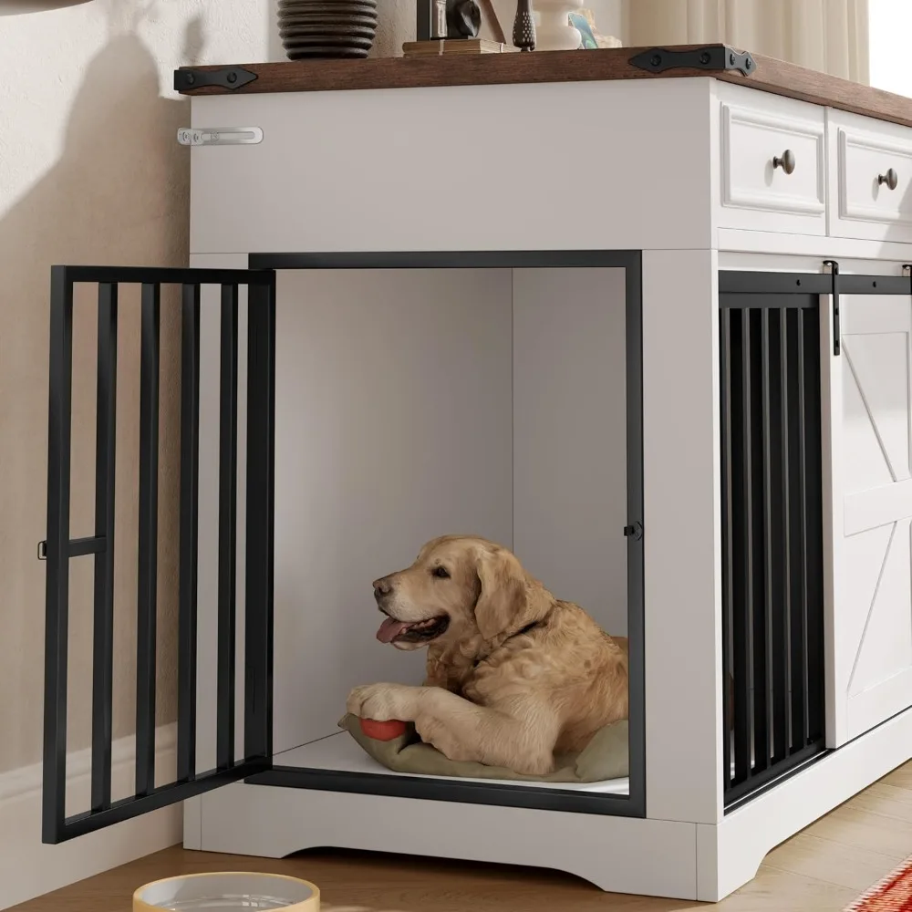 - Double Door Design with Sliding Barn Door: This dog crate furniture features a versatile double door design, including a side opening door and a front sliding barn door. The barn door smoothly slides left or right, allowing flexible access while making it easier for your pets to enter and exit from multiple directions.