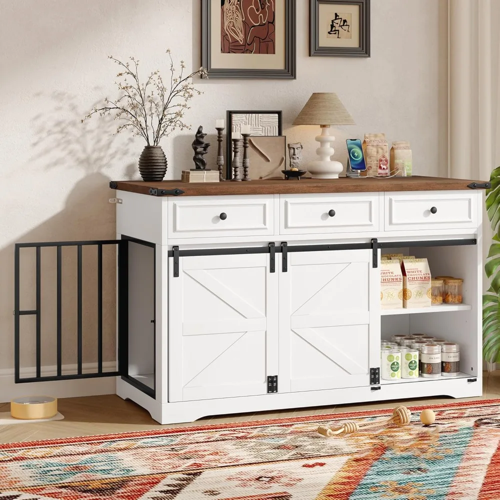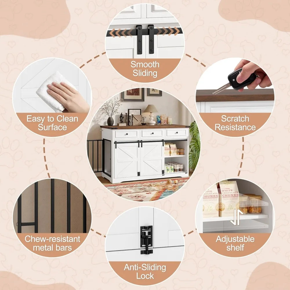 55.1" Furniture Style Dog Crate Furniture, Indoor Dog Kennel with 3 Storage Drawers, Farmhouse Dog Crate with Side Door and Slid