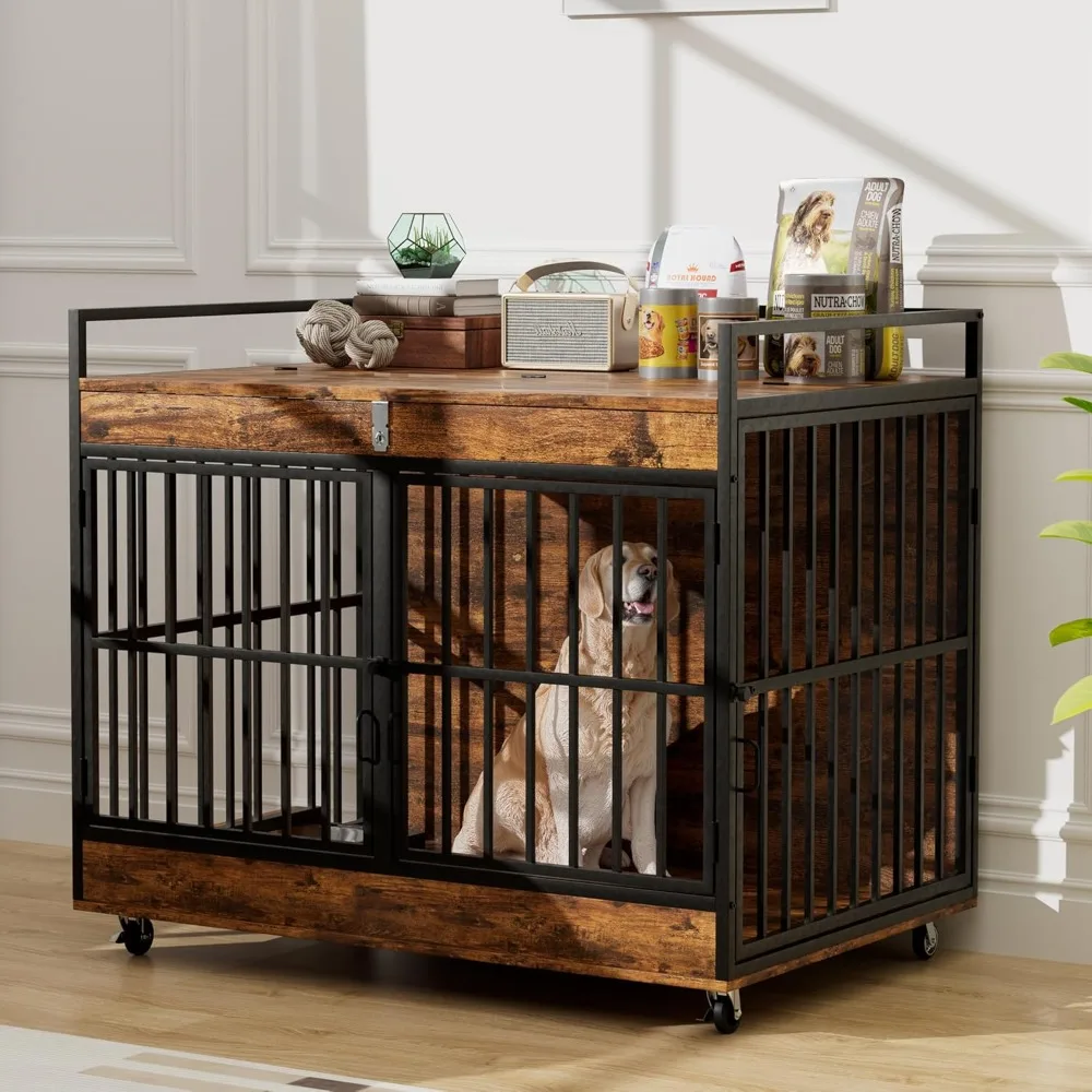 This product is a large dog crate furniture designed for medium to larger breed dogs. It measures 45 inches wide, 37 inches deep, and 30 inches high, providing ample space for your pet to stand, turn, and stretch comfortably. The crate features a secure locking mechanism to ensure your pet's safety and prevent escape. The dog crate has a dual-door design with an adjustable side entry, allowing you to install the side door on either the left or right side to fit your home layout. It also includes two stainless steel bowls for your pet's food and water needs. Constructed with thickened metal tubes and solid wood panels, this dog crate is durable, chew-resistant, and built to last. It offers long-lasting safety and reliability for energetic dogs. The interior of the crate is spacious and comfortable, providing plenty of room for pets to relax and move freely. It can also accommodate bedding, toys, and other essentials to create a cozy resting space for your pet. Assembly is easy with clear instructions, labeled parts, and tools included. If you encounter any issues, our dedicated support team is available to assist you within 24 hours.