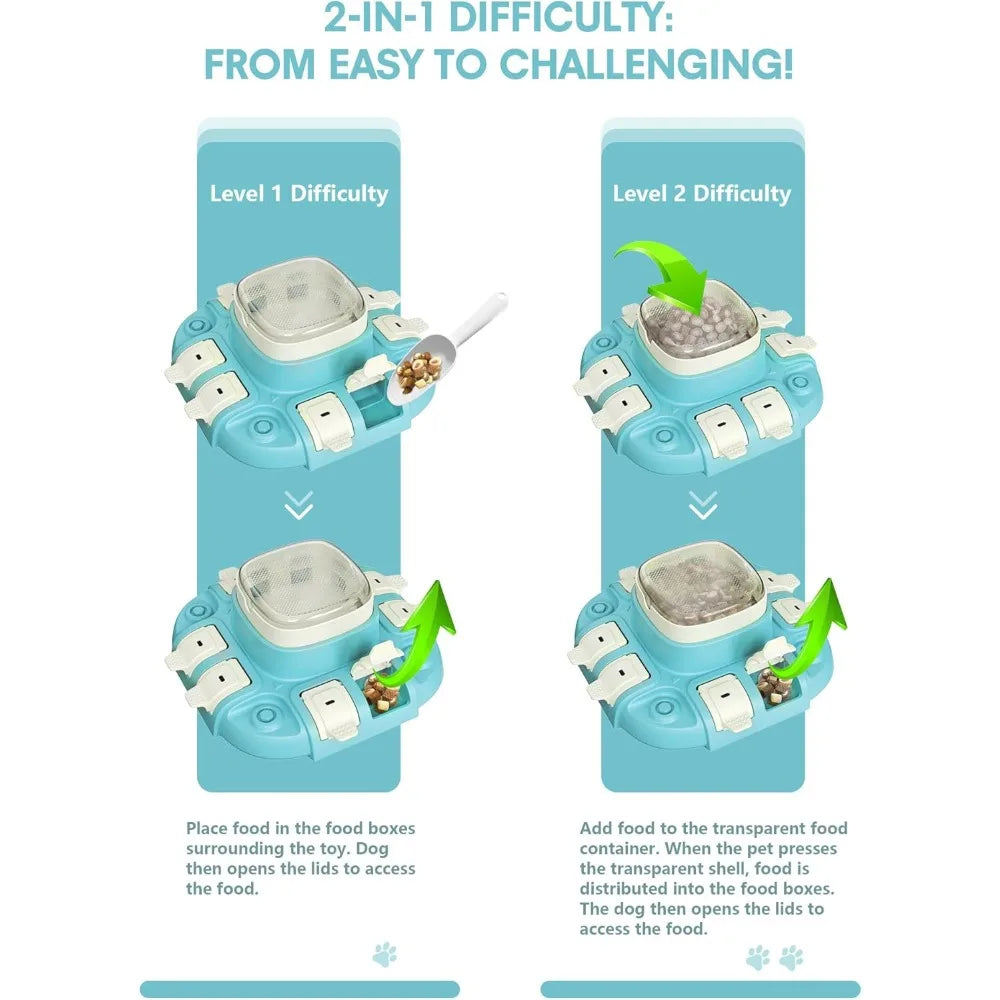 - 2 LEVELS IN 1 PUZZLE TOY FOR DOGS - Start with Level 1, add some treats in the base compartments and watch your dogs get their tasty reward by nudging the lids. Ready for a greater test? Move on to Level 2 by filling the top compartments with treats, teach your dog to press down on the top cover, releasing the treats into the base compartments, where they can enjoy their earned snack with a sense of accomplishment.