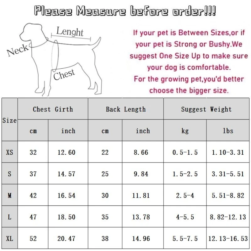 XL Chest 52cm/20.47'' ;Length 38cm/14.96'' ; Suggest Weight 5.5-7.5kg/12.13-16.53 lbs
