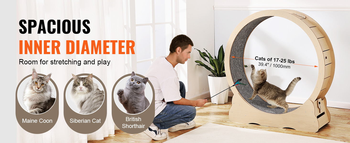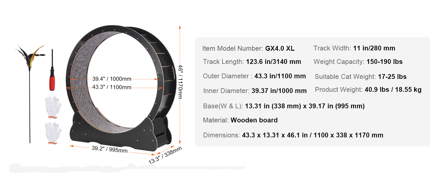 Ideal for Cats of Various Sizes: Featuring an external diameter of 43.3 inches (1100 mm) and an internal diameter of 39.37 inches (1000 mm), this cat exercise wheel is designed to suit cats of different sizes, with a weight capacity of up to 25 lbs. It provides ample space for your feline companions to move, stretch, and expend their energy comfortably